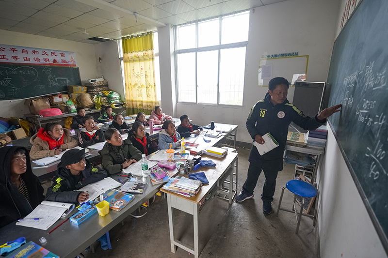 瓦吾小學(xué)教師曲比史古(右一)在給五年級學(xué)生上數(shù)學(xué)課(5月27日攝)。新華社記者 沈伯韓 攝