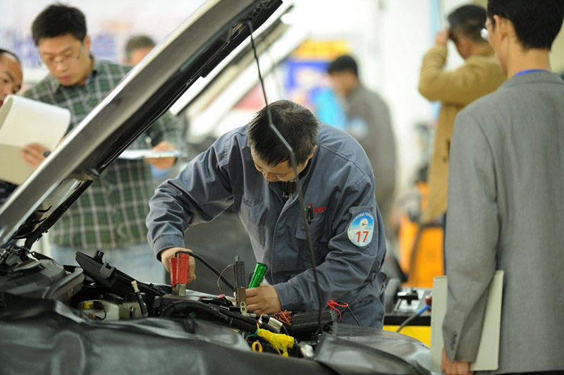 參賽選手在貴陽市第二屆技能之星競技大賽決賽汽車維修項目比賽中(2015年11月17日攝)。大賽吸引5000余名來自貴州省中、高等職業(yè)院校的學(xué)生參加。新華社記者 陶亮 攝