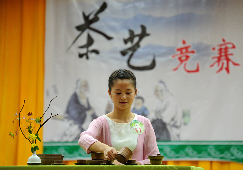 參賽選手在貴陽市第二屆技能之星競技大賽決賽茶藝展示比賽中(2015年11月17日攝)。大賽吸引5000余名來自貴州省中、高等職業(yè)院校的學(xué)生參加。新華社記者 陶亮 攝