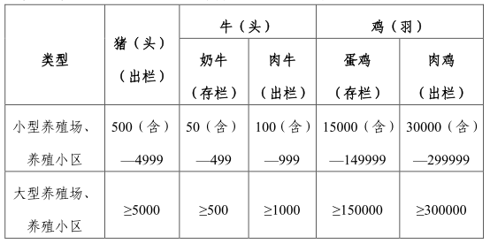 第三條 單一品種畜禽養(yǎng)殖規(guī)模的劃分標準如下:
