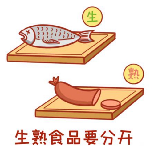 正確做法:生熟食菜板分開使用。生熟食物的存放器皿、操作案板等一定不能混合使用,所有食物也要保證充分加熱,做熟后再食用。
