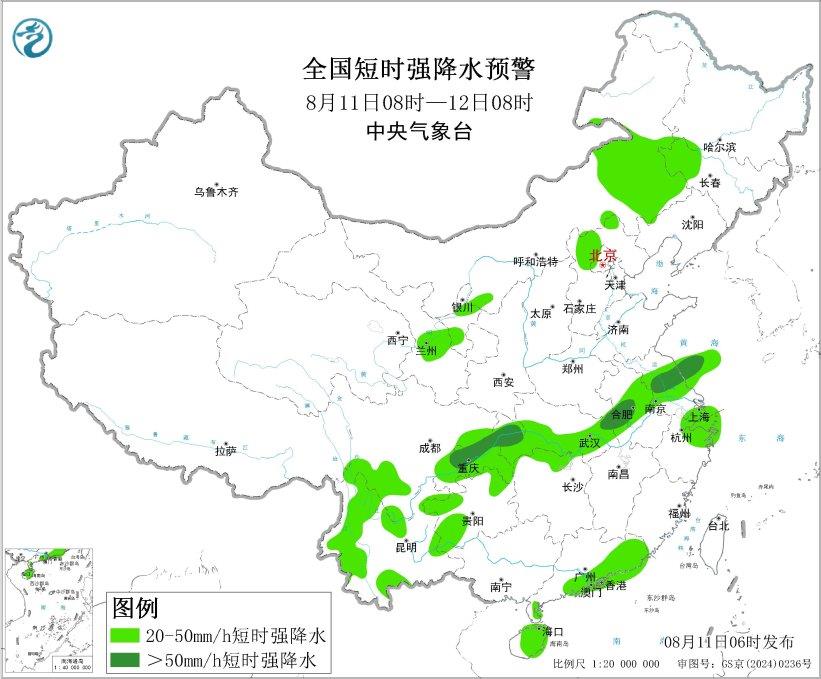 預(yù)計(jì)8月11日08時(shí)至12日08時(shí),內(nèi)蒙古東部、華北北部、西北地區(qū)東部、西南地區(qū)東部等地的部分地區(qū)將有8級(jí)以上雷暴大風(fēng)或冰雹天氣,其中,內(nèi)蒙古東部、河北西北部等地的部分地區(qū)將有10級(jí)以上雷暴大風(fēng),最大風(fēng)力可達(dá)11級(jí)以上;內(nèi)蒙古東部、華北北部、西北地區(qū)東部、江淮、江漢、江南北部、西南地區(qū)東部、華南南部等地的部分地區(qū)將有小時(shí)雨量大于20毫米的短時(shí)強(qiáng)降水天氣,其中,安徽中部、江蘇中部、湖北西部、四川東南部、重慶中西部和東北部等地的部分地區(qū)小時(shí)雨量大于50毫米,最大可達(dá)70毫米以上。